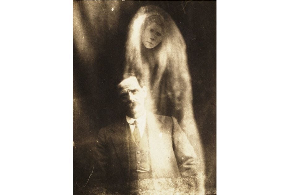 A stoic man sits for his portrait, unaware that a pale face floats just above his shoulder. The ghostly figure appears young, almost childlike, gazing with sorrow. Mediums of the early 1900s claimed spirits often attached themselves to family photographs. Coincidence—or evidence of a loved one refusing to let go?